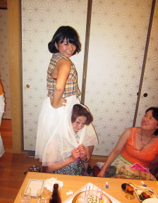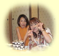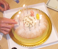 | ●お祝いの言葉と共になぜかスカートを被せられる先生・・ ●願いを込めてキャンドルを吹き消します(^◇^) ●実は『即席ペール』が気に入っている先生(^_^;) |