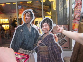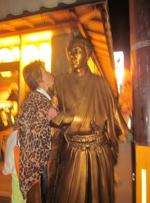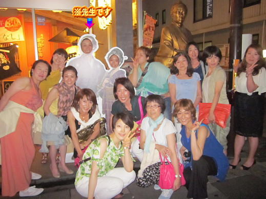 ●お店の前で集合!さあ、ホテルに戻りましょう〜!最後まで龍馬のパネルから離れないお茶目な先生(*^_^*) |