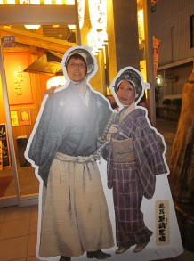 | ●お誕生日会会場 坂本龍馬ゆかりの旗籠風がいい感じ(#^.^#) お店の前にはこんな撮影スポットがあります 早速 龍馬になりきる先生 |