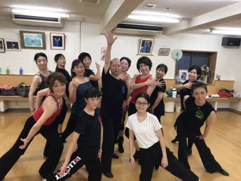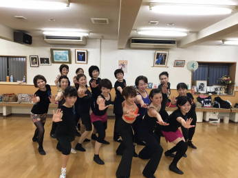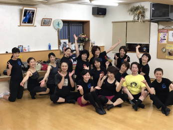 | ●ホップ、ジャンプ、ターンとサビに向かってどんどん動きが大きくなっていきます!繰り返しも入ってヘロヘロになりながら、全員 力一杯踊りきりました! レッスン後に久し振りの男性メンバーを囲んでハイ・チーズ!今日も最高!楽しいレッスンでした(#^^#) |