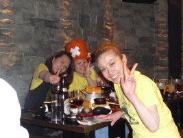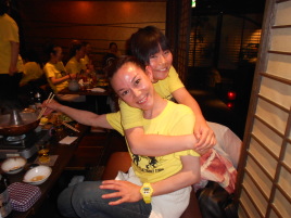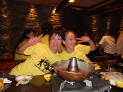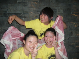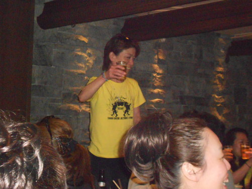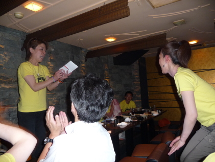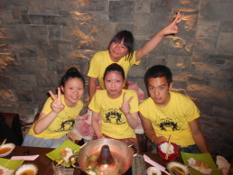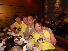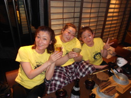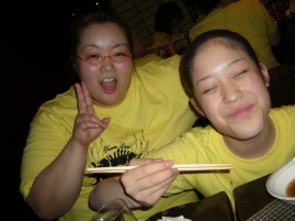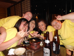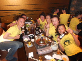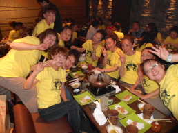 | ●喜びのポーズ(?)の先生 ●打ち上げでもモテモテ!のサミー(なぜか頭におしぼり)・・・次第に不可解な動きを見せ始める黄色い軍団・・・ |
